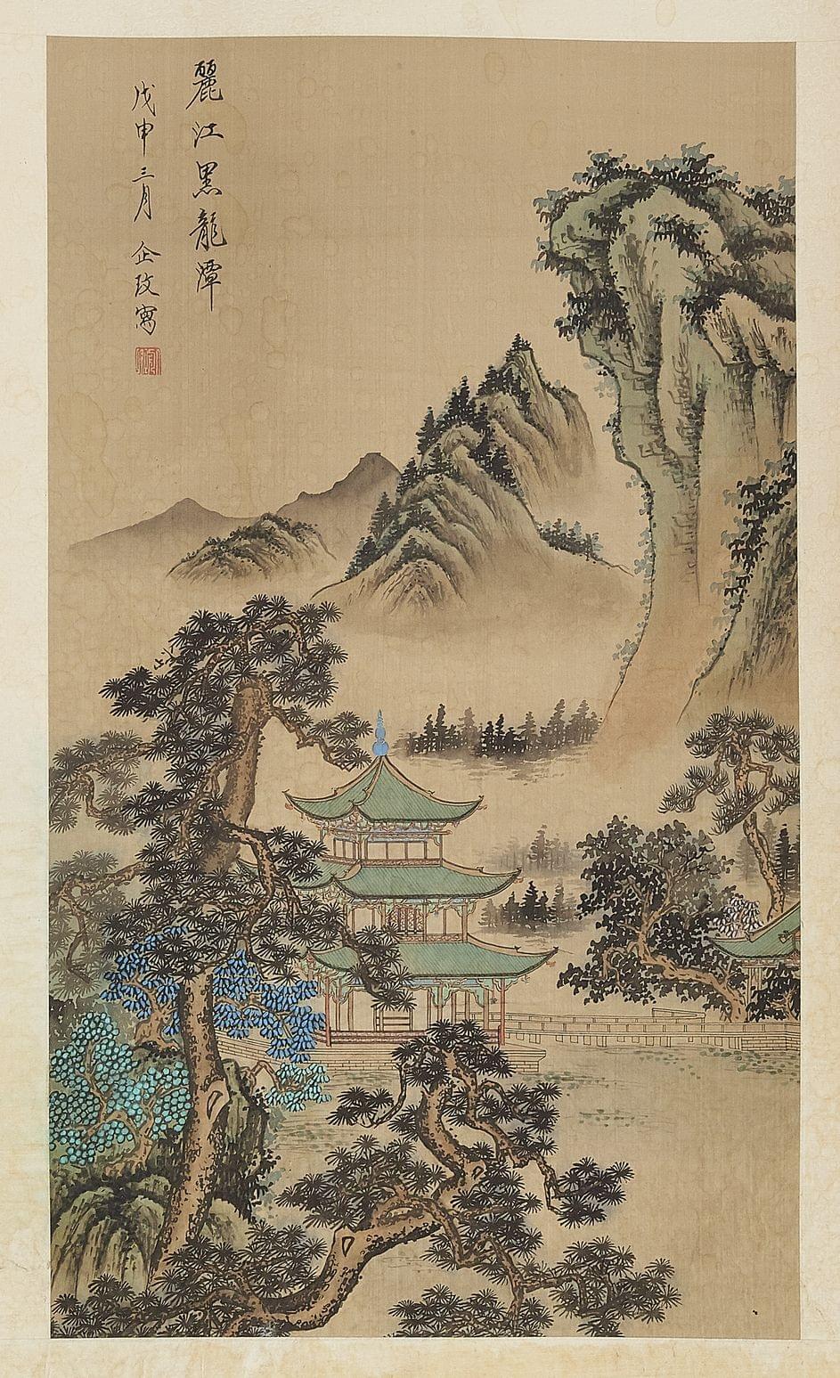 Paysage avec un temple, encre et aquarelle sur papier, monté en rouleau. 62x37 cm