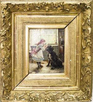 Fillette au chien, huile sur panneau, signée E Fleur, 22x16 cm