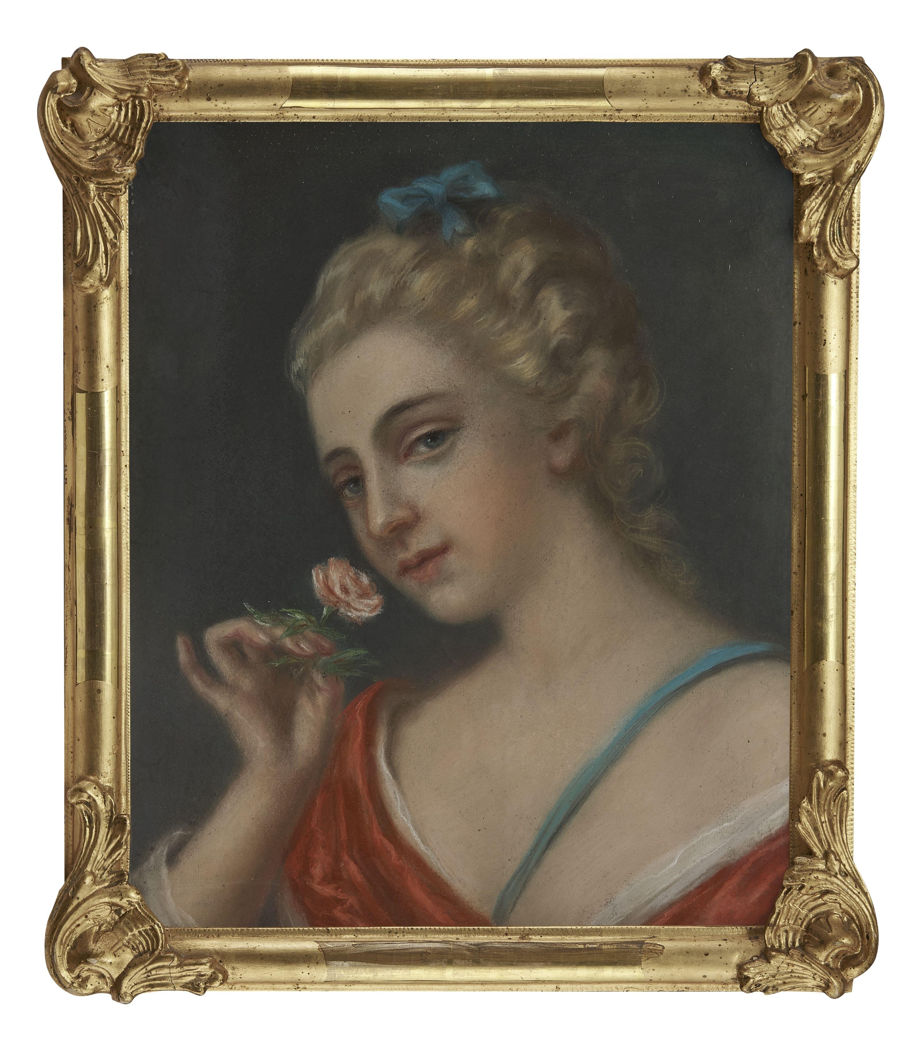 Portrait de femme à la rose, pastel sur papier, 47x38 cm