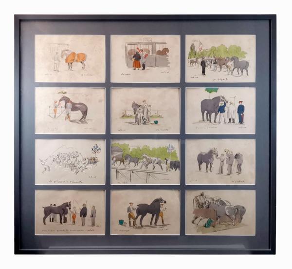Ensemble de 12 lithographies sur le thème du cheval, monogrammées, chacune 18x27 cm