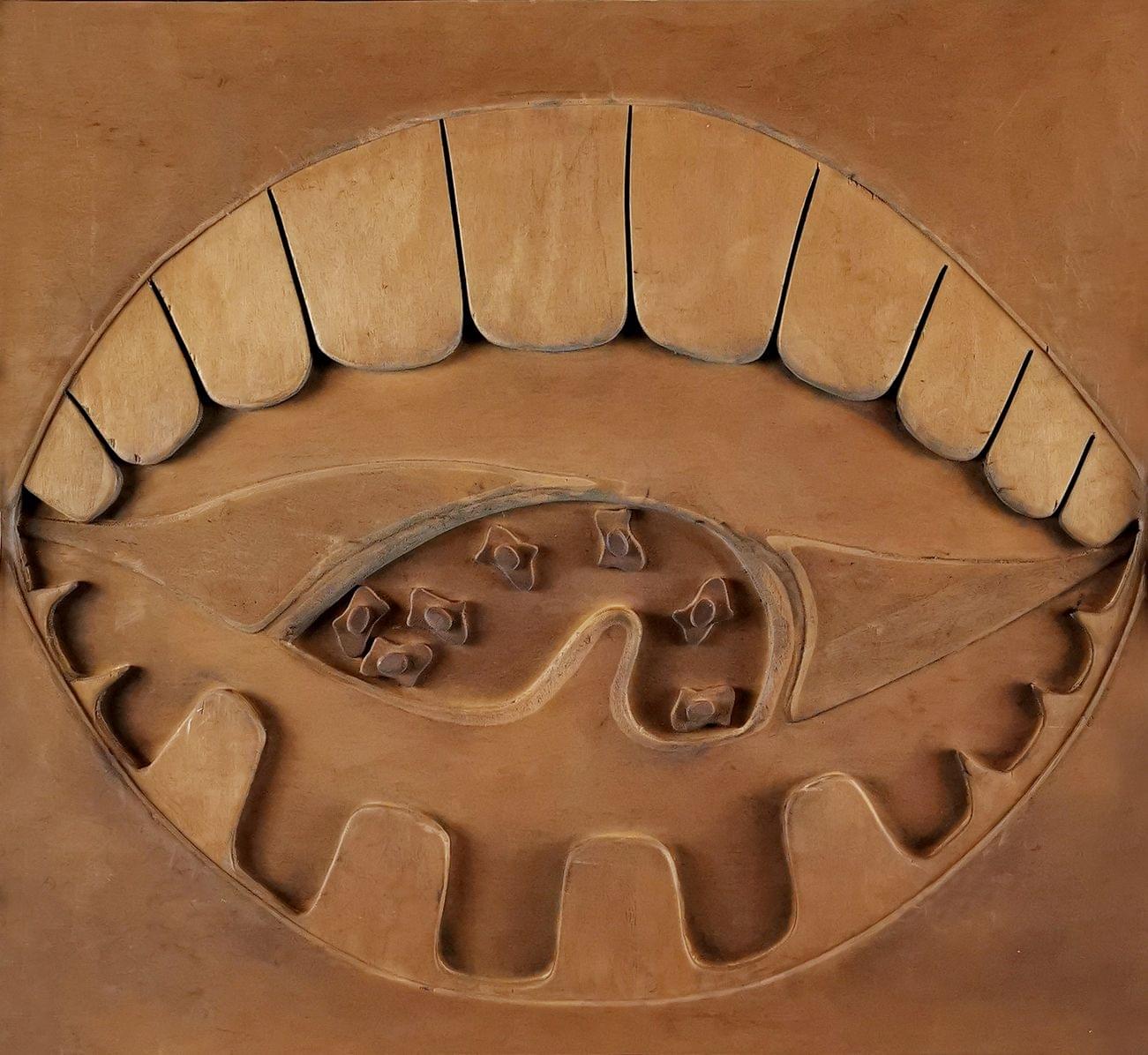 Composition abstraite en bas-relief, bois sculpté, 58x58 cm