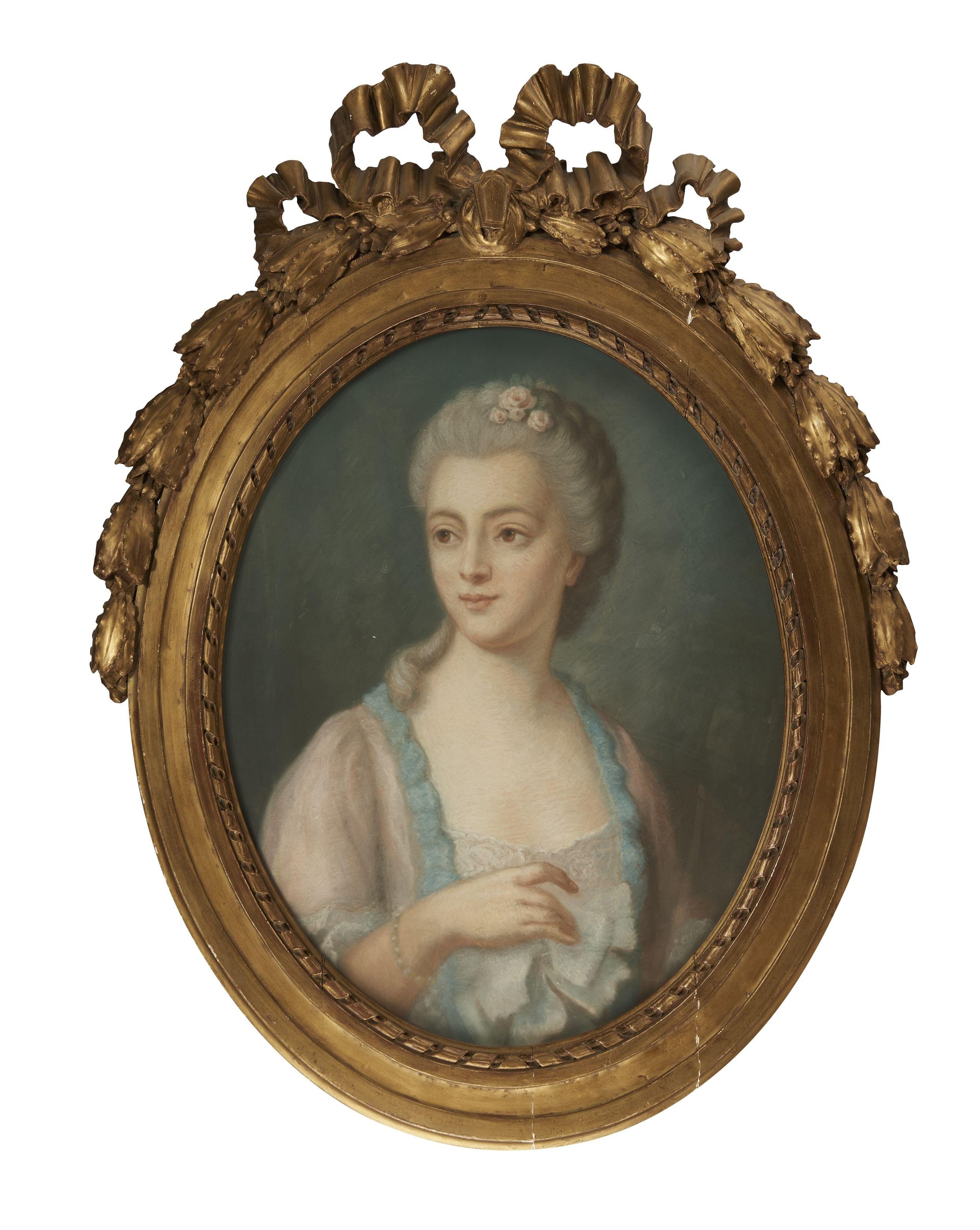 Dame de qualité, pastel sur papier, cadre en bois sculpté et doré, 56x44 cm