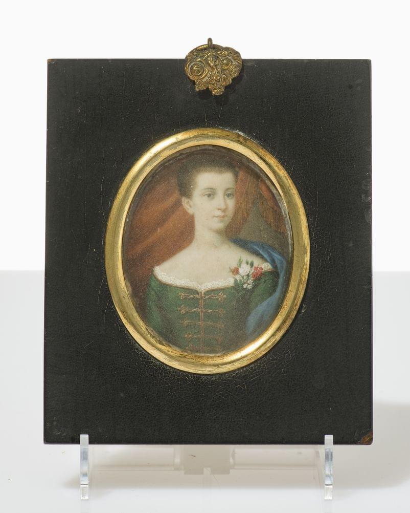 Portrait de jeune femme à la robe verte, miniature ovale sur ivoire, 7x5,5 cm