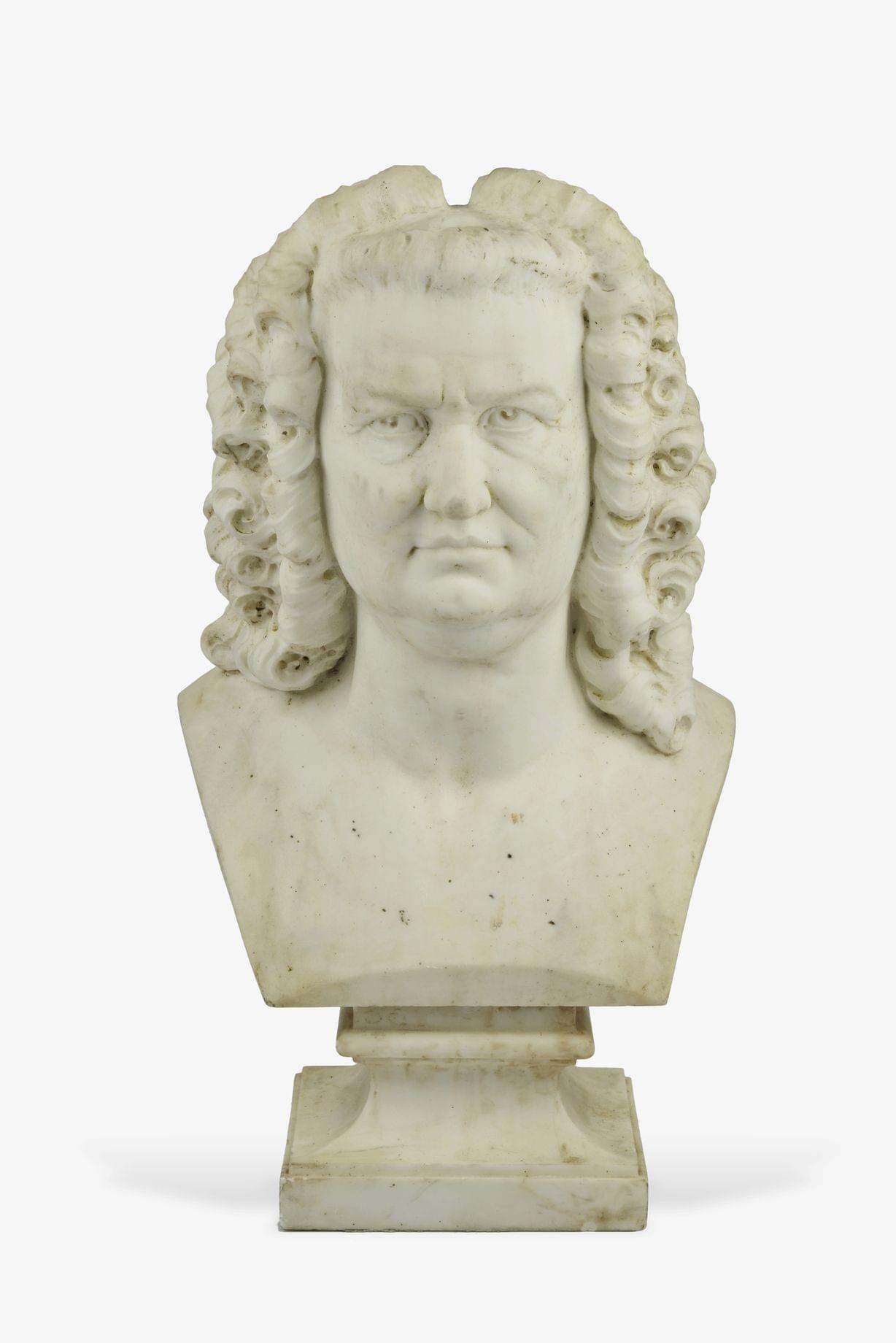 Portrait de Jean-Sebastien Bach, marbre blanc sculpté sur piédouche, H 80 cm