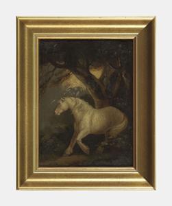 Poney sous un arbre pendant l'orage, huile sur panneau, 21x16 cm