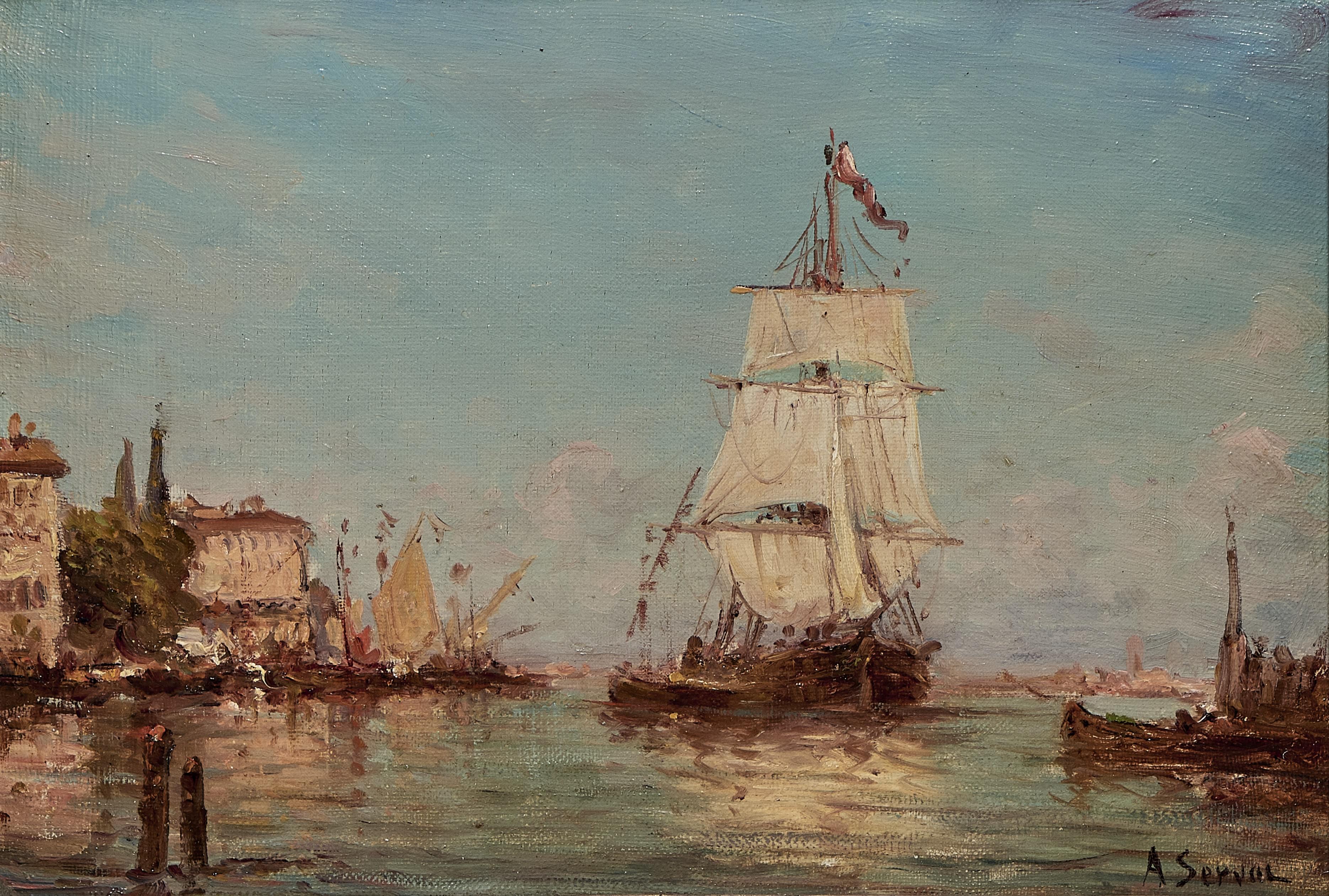 Voilier rentrant au port, huile sur toile, signée Serval, 23x34 cm