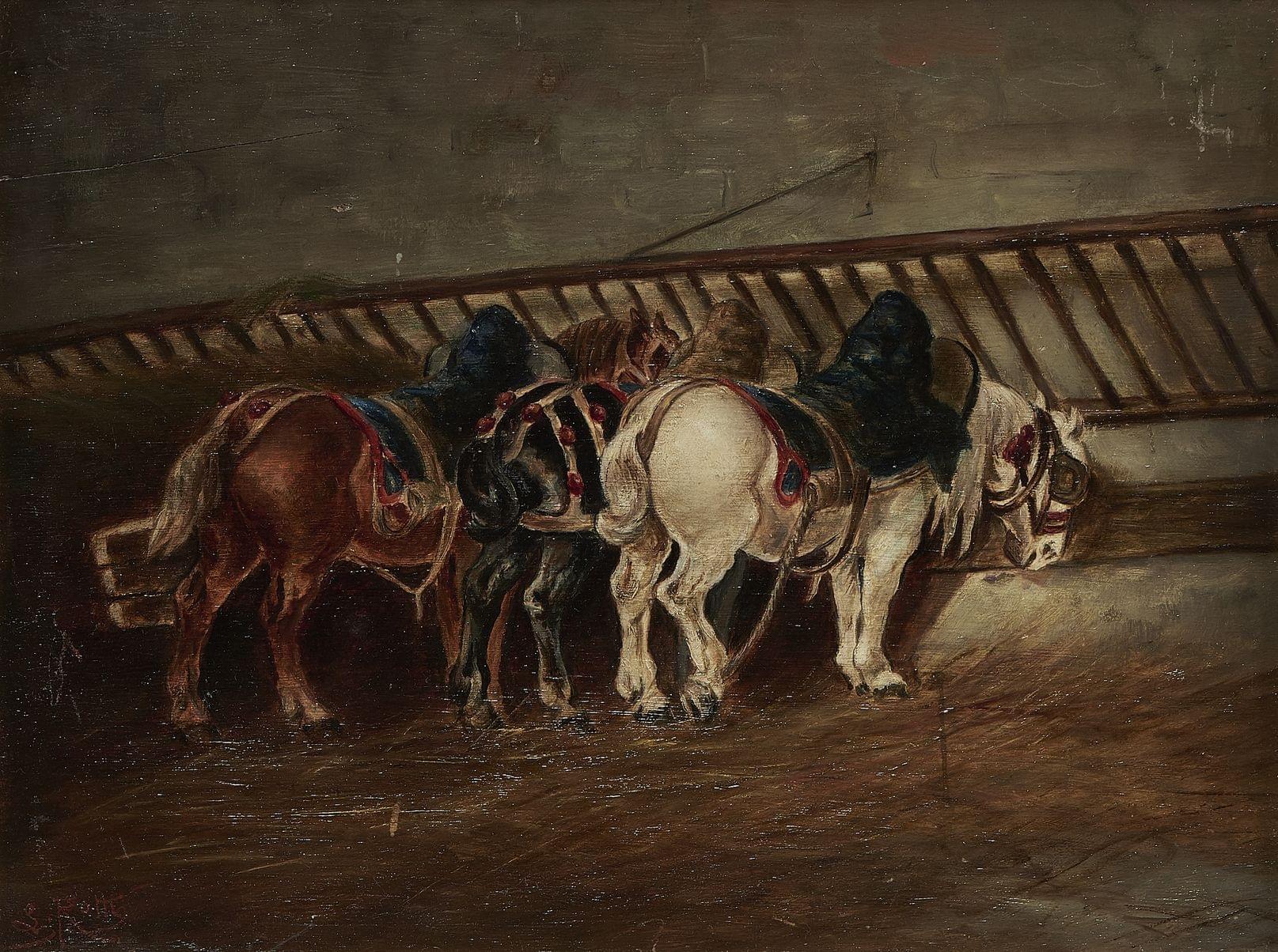 Chevaux dans l'écurie, huile sur panneau, signée, S.Rotti, 22x29 cm