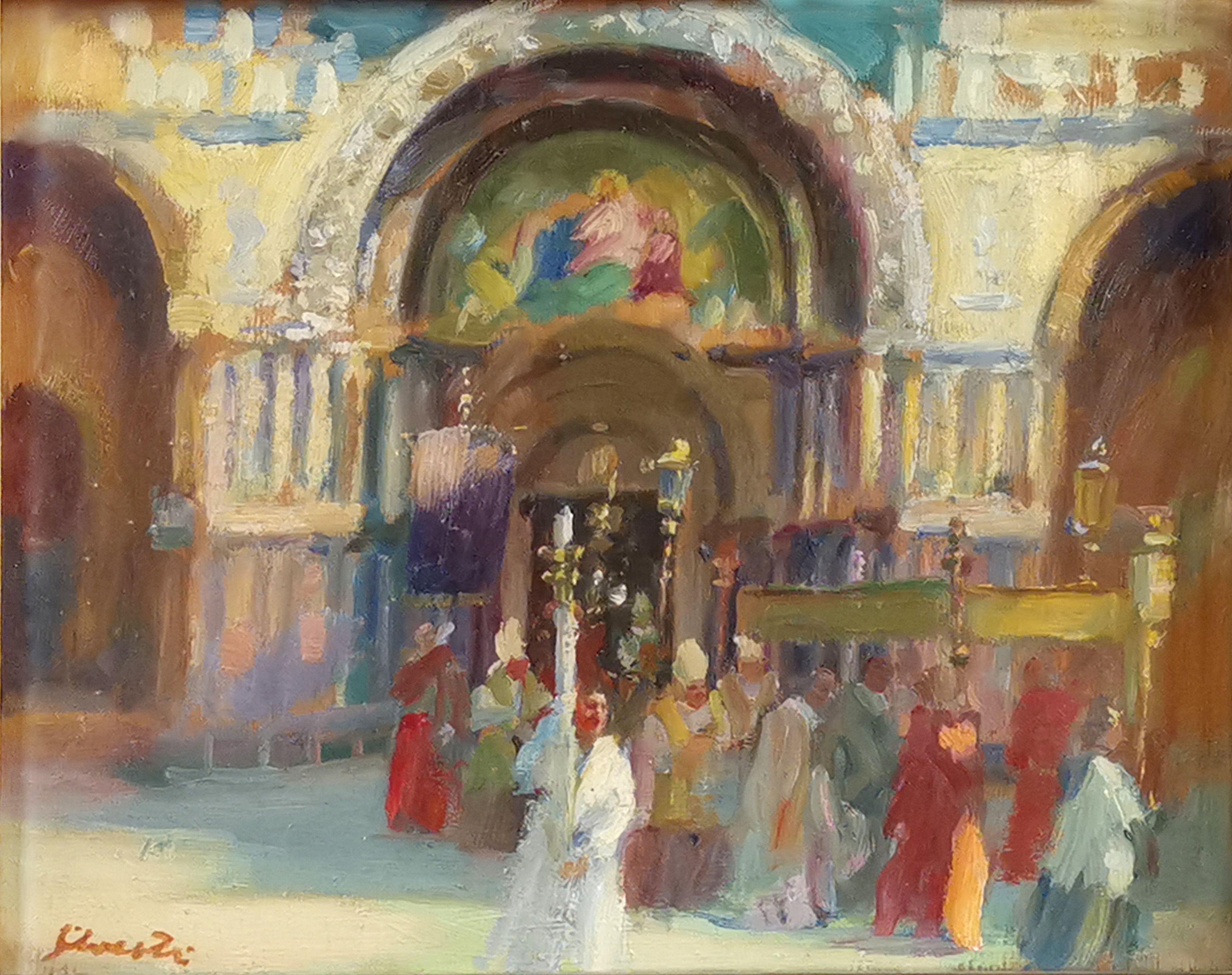 Procession à la sortie d'une église, huile sur panneau, 24x19,5 cm