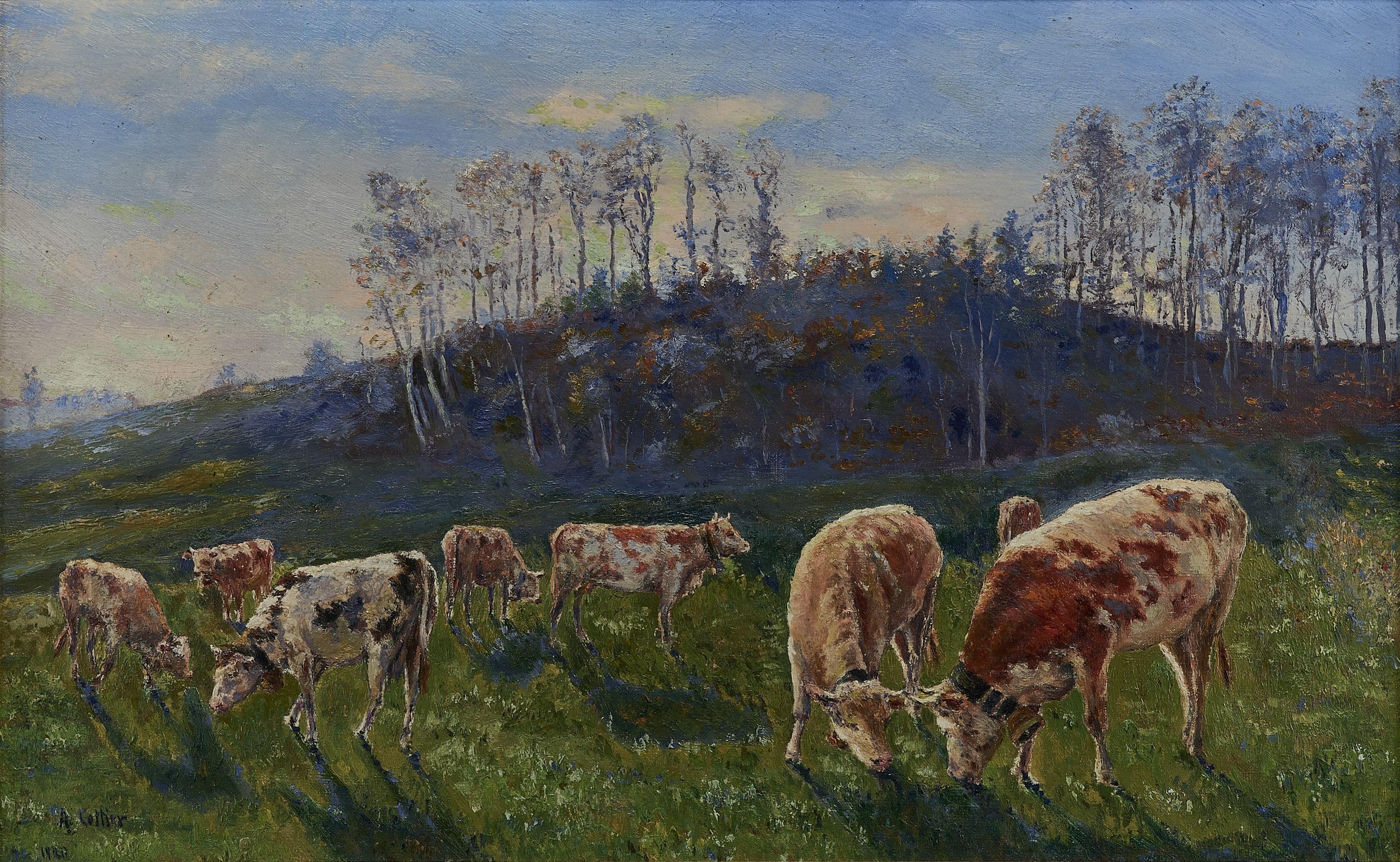 Vaches au pré, huile sur toile, signée et datée 1920, 38x60 cm