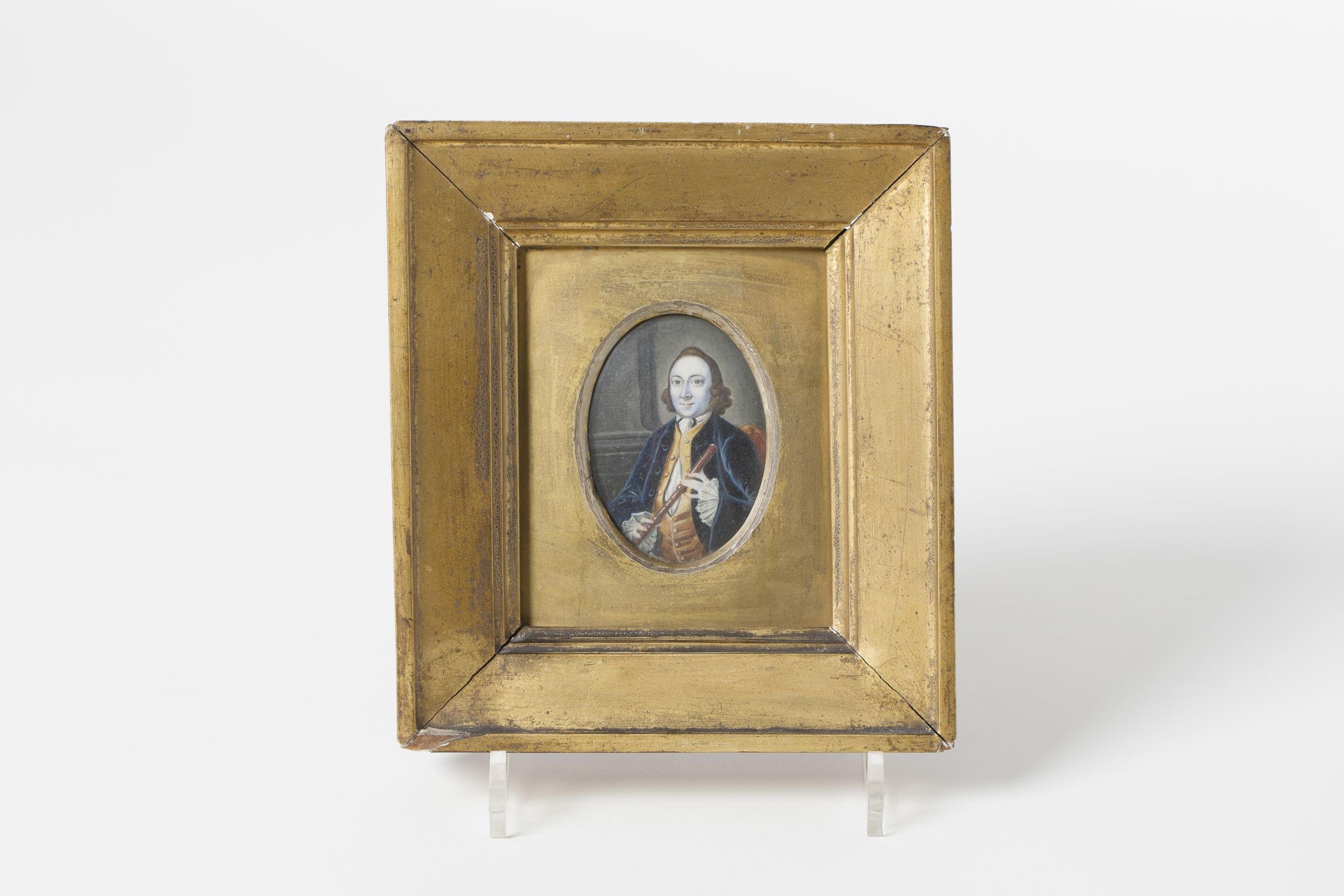 Portrait de flûtiste, miniature ovale sur porcelaine, 8x5,5 cm