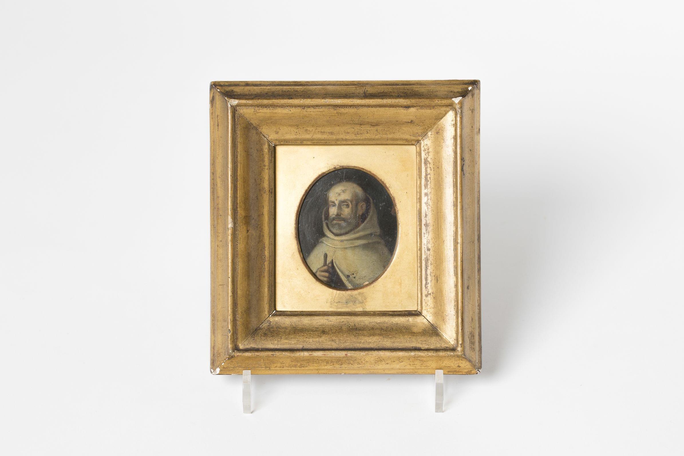 Portrait d'un religieux au manteau blanc, miniature ovale sur cuivre, 7,5x6,5 cm