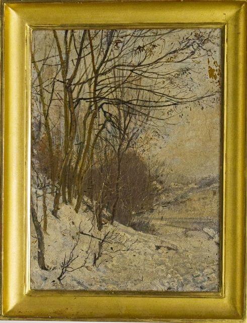 Paysage enneigé, huile sur carton, signature non identifiée, 23x32 cm
