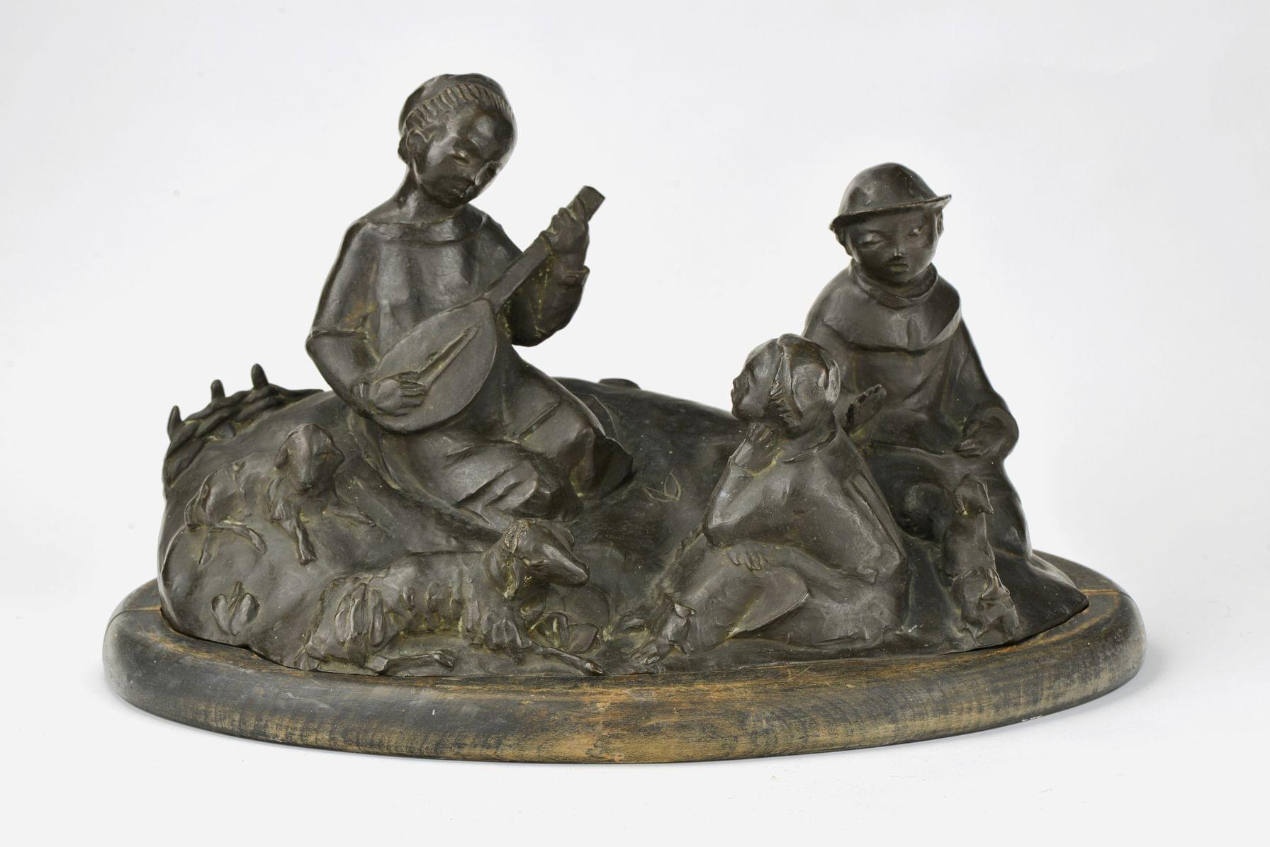 Enfants écoutant la mandoline, groupe en bronze patine médaille, monogramme P.F. sur la terrasse, H 28 cm