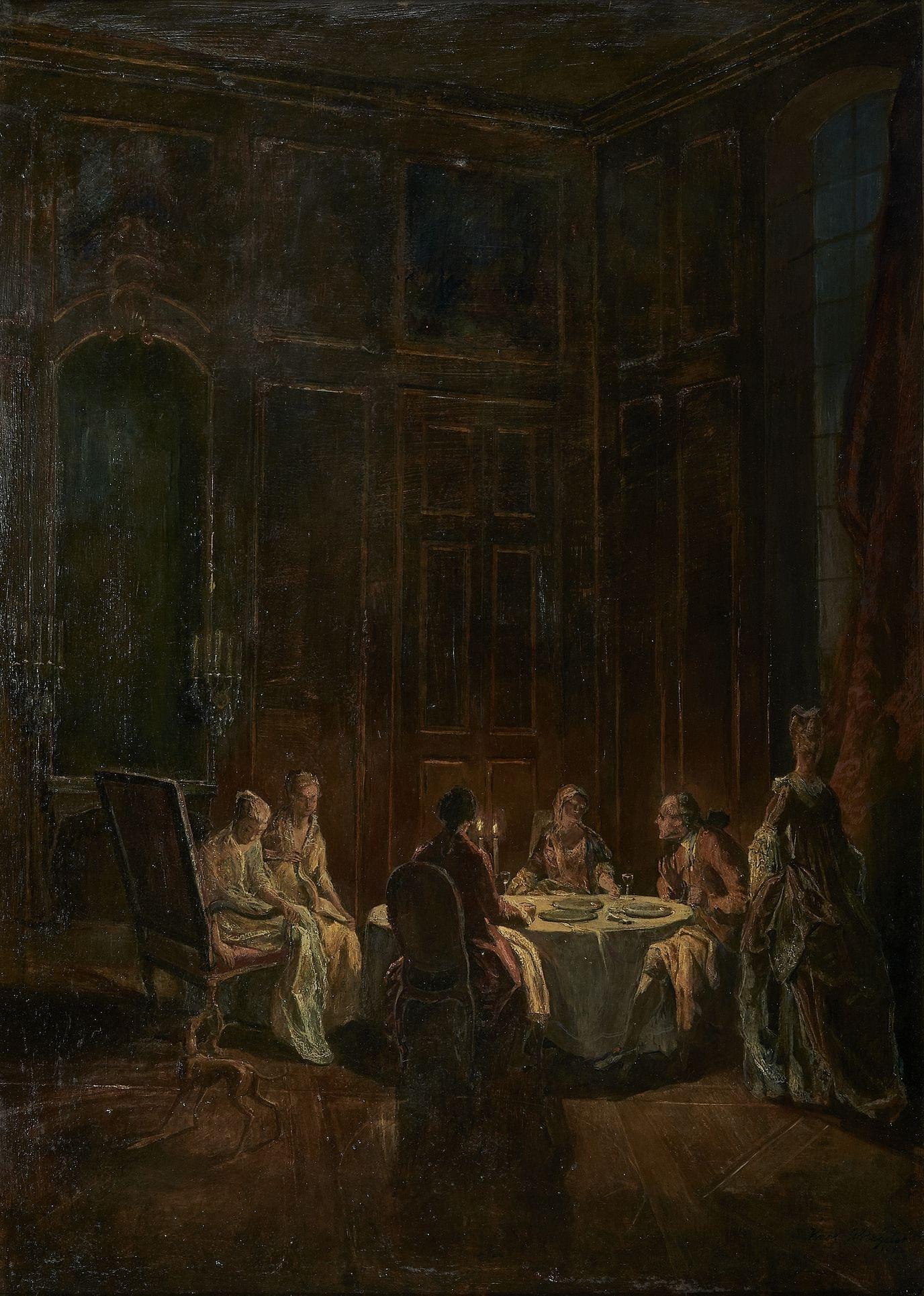 Dîner à la lueur d'une chandelle, huile sur carton, 70x48 cm