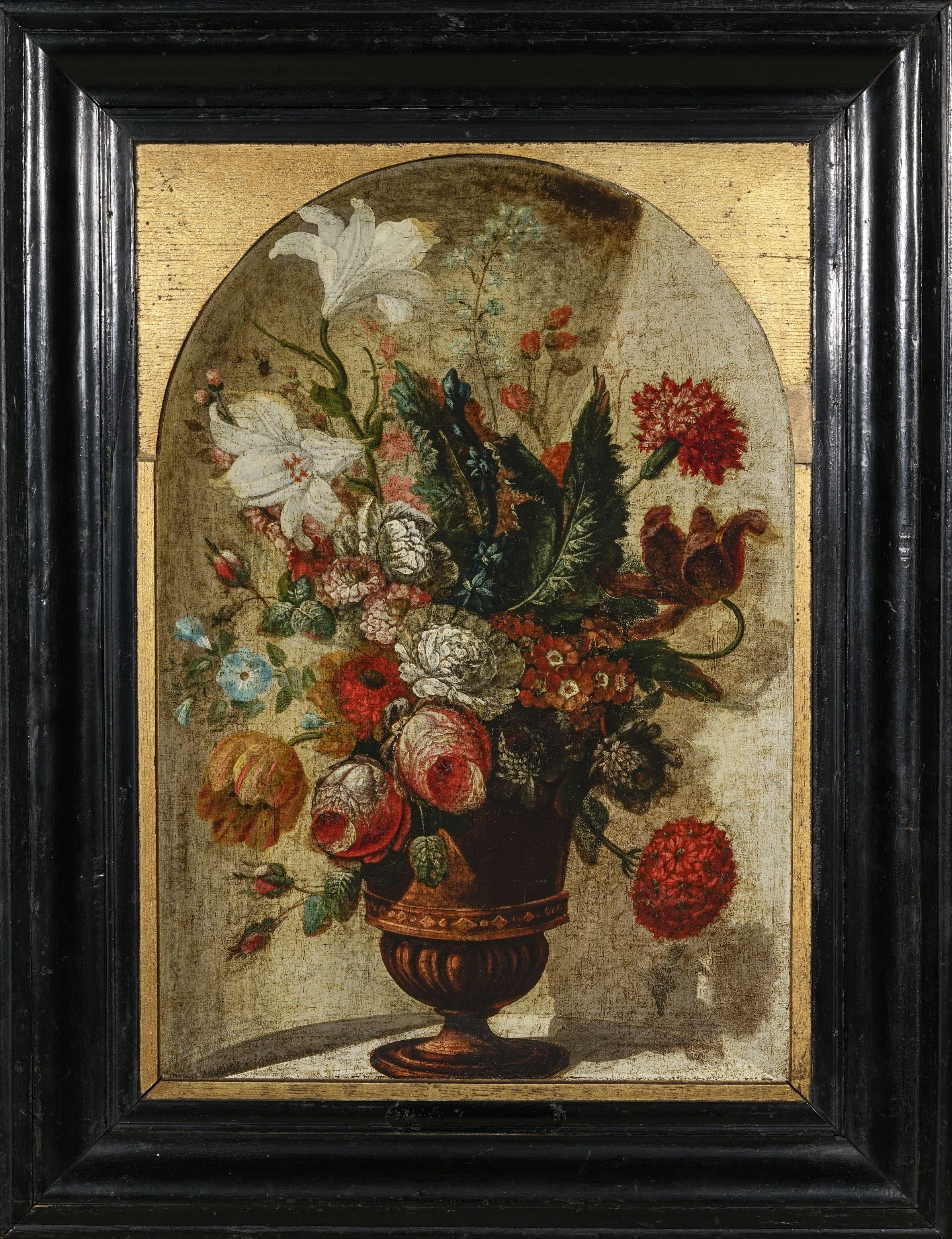 Bouquet de fleurs dans un vase Médicis, huile sur toile, 63x45 cm