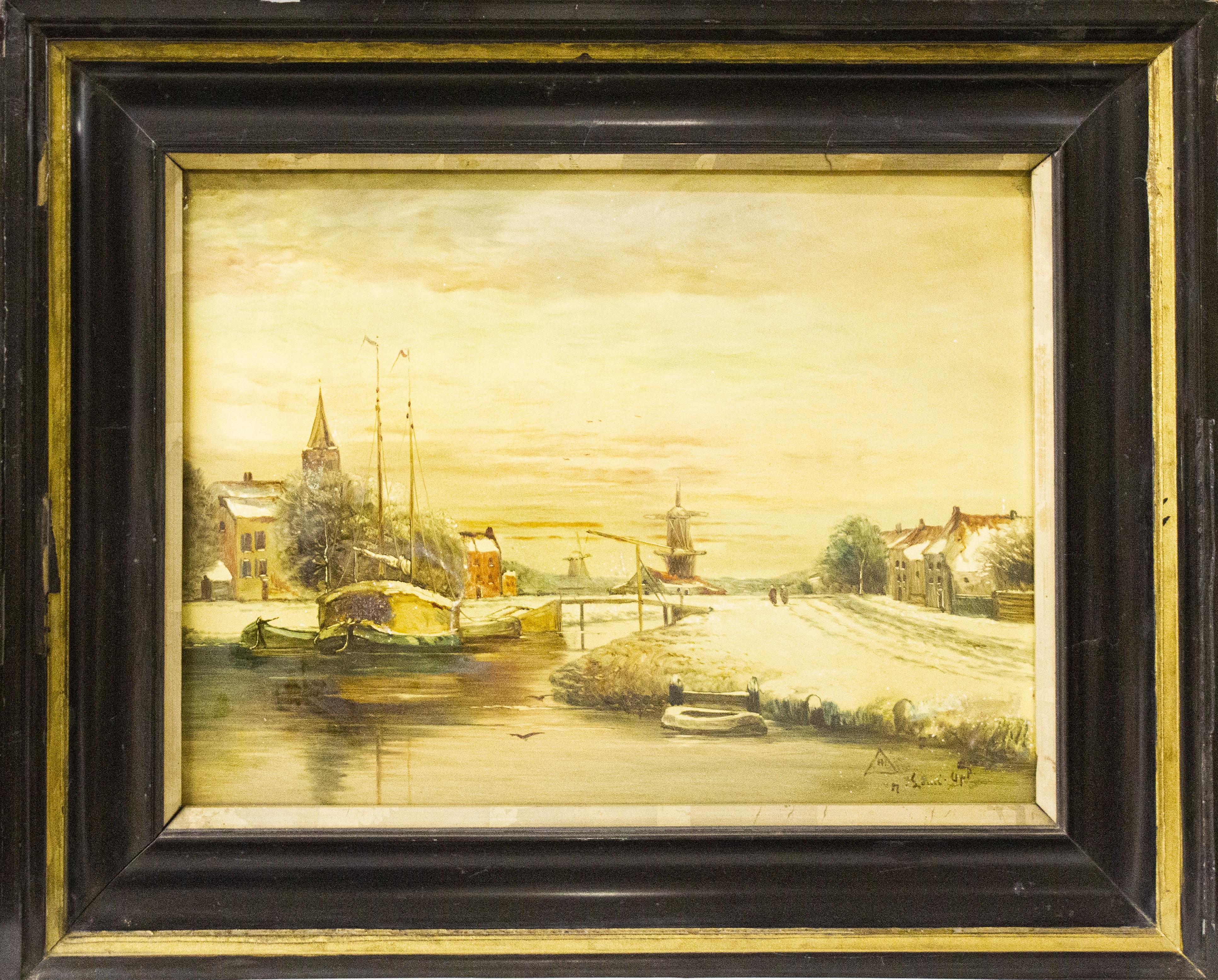 Paysage avec moulins à vent, huile sur cuivre, signature illisible, 30x40 cm