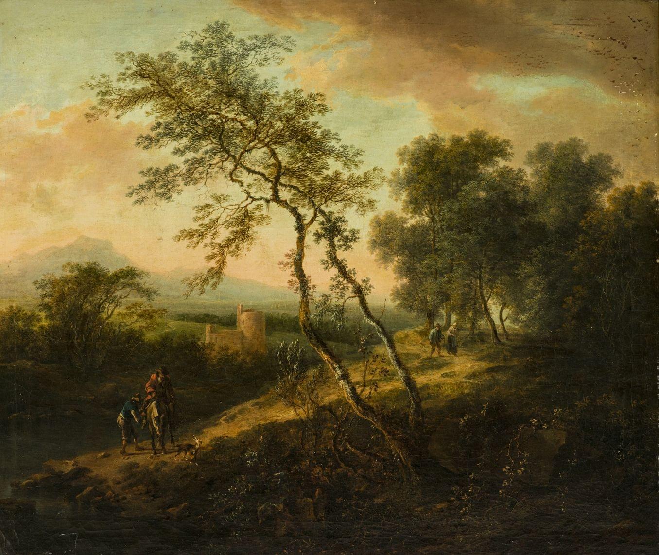 Chemin animé le long d'une rivière, huile sur toile, 65x78 cm