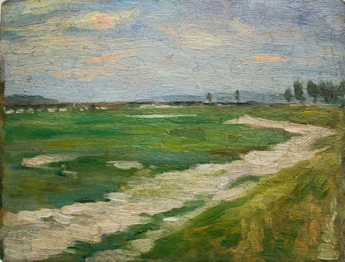 Chemin dans la plaine, huile sur panneau double face (au dos étude de personnage), 26x35 cm