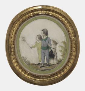 Trois enfants, crayon et aquarelle en tondo sur papier, 32x30 cm