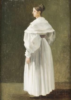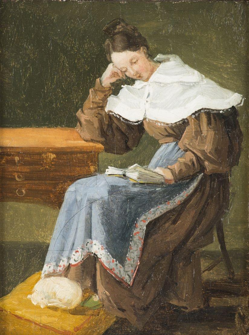 Femme à la lecture et femme à la robe blanche, paire d'huiles sur toile marouflées sur carton, 19x14,5 cm