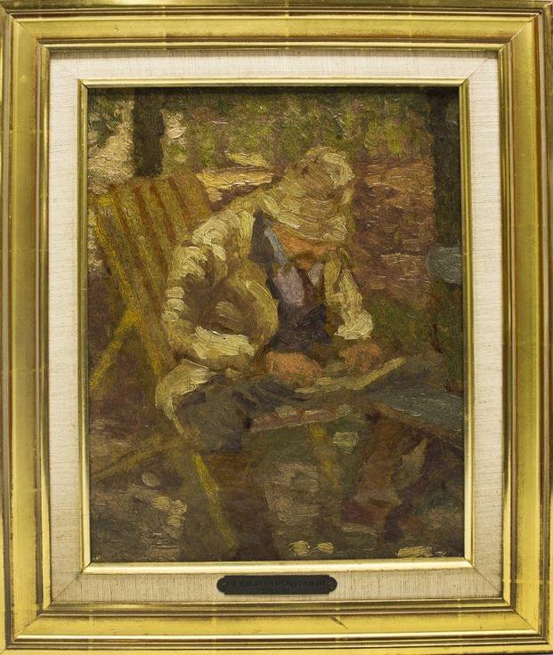 Homme lisant assis sur une chaise longue, huile sur toile, 24,5x32,5 cm