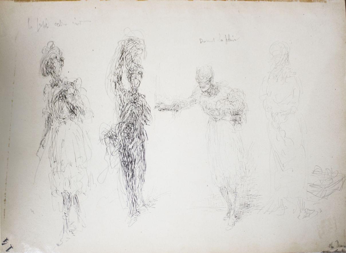 Quatre silhouettes, encre et crayon sur papier, signature apocryphe de H. Daumier, 19x30 cm