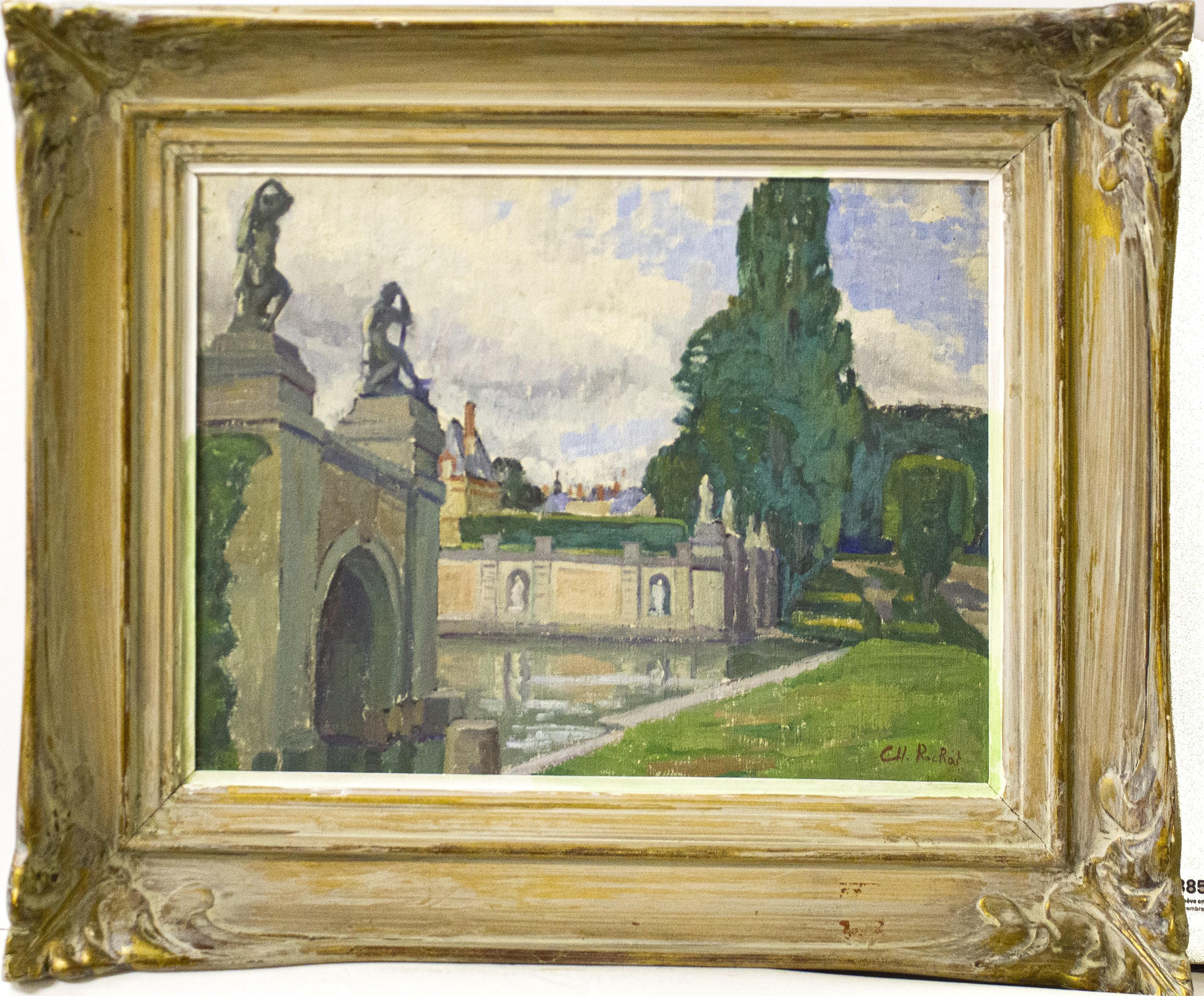 Fontaine dans le parc du château de Fontainebleau, huile sur panneau, signée Ch. Rochat, 27x34 cm