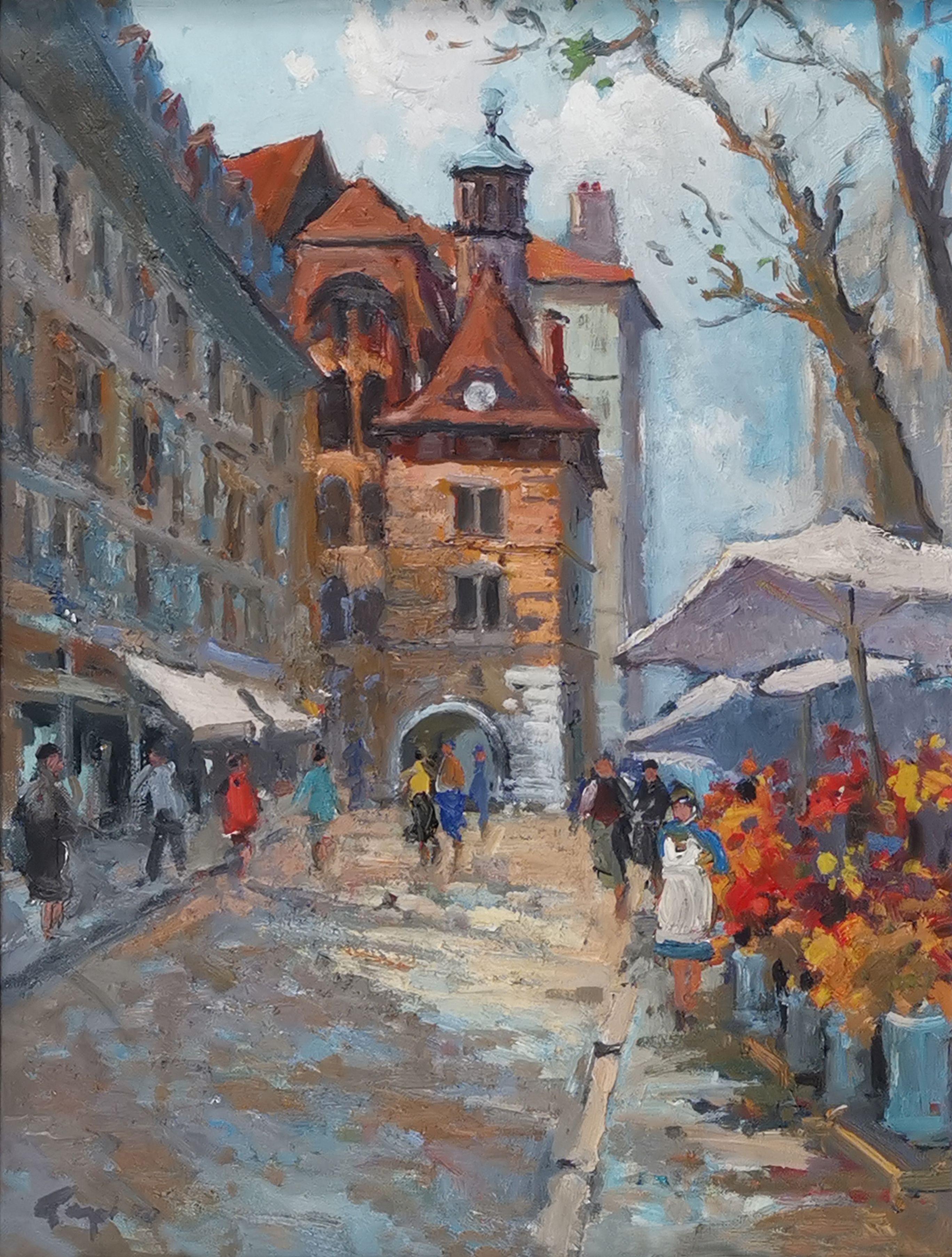 La place du Molard, huile sur toile, signature illisible, 60x46 cm