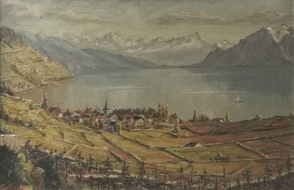 Vue du lac Léman depuis le Lavaux, huile sur pavatex, signée E.Meyer, 38x58 cm