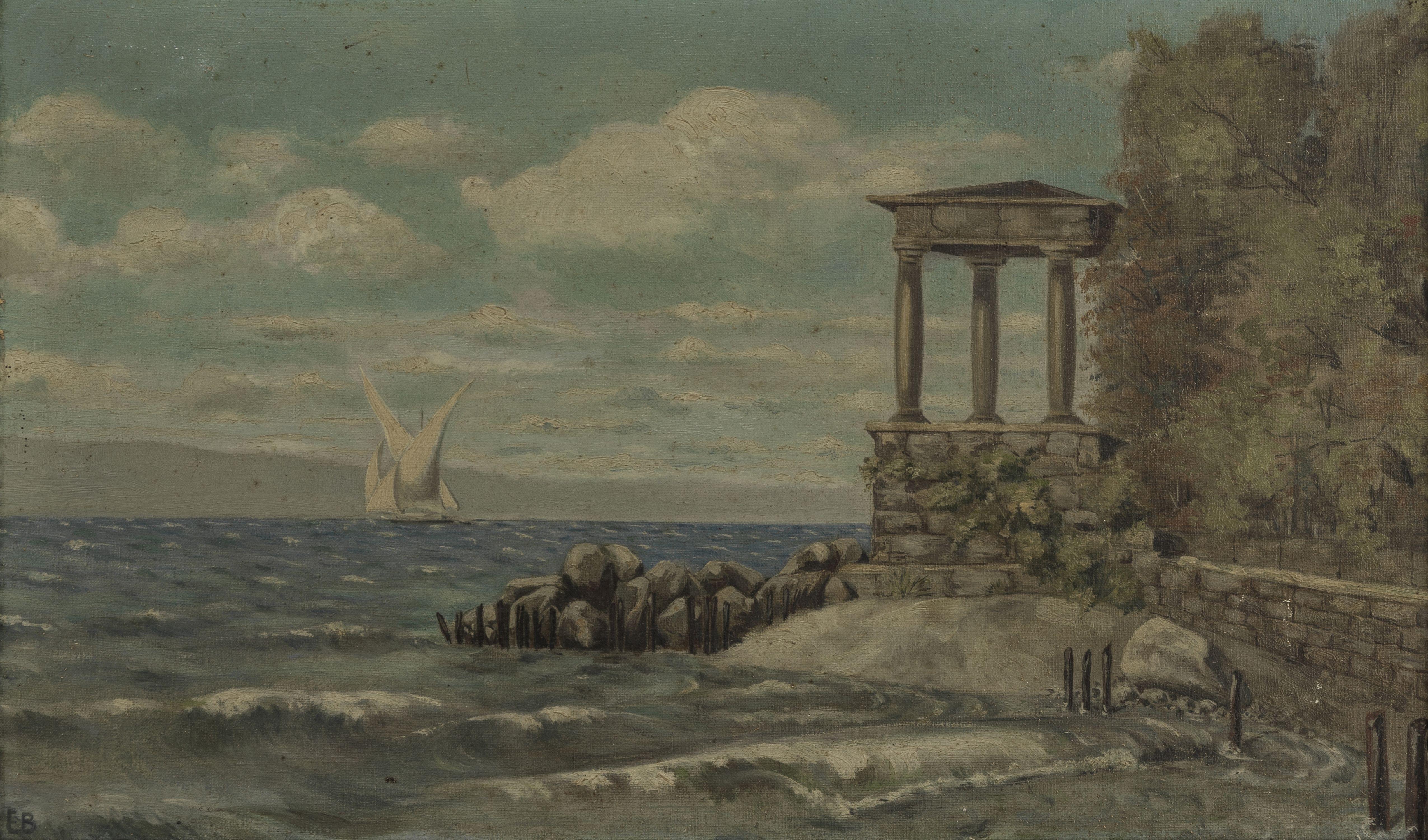 Petit temple dans la propriété de l'Aga Khan à Collonge Bellerive, huile sur toile, monogrammée, 37x60 cm