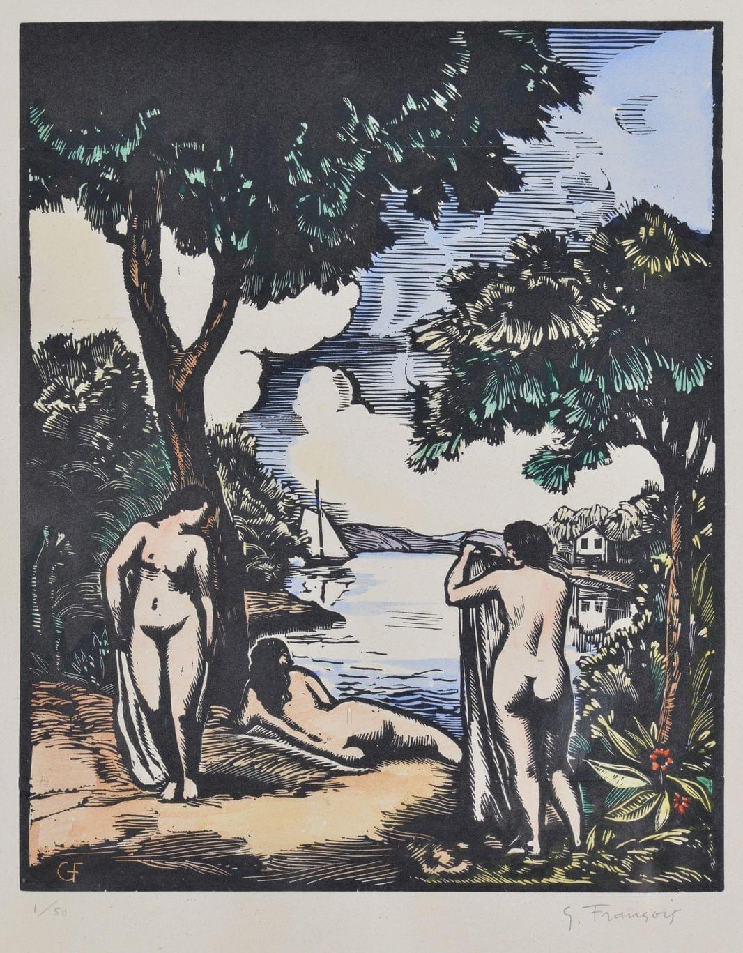Trois femmes se baignant à la rivière, gravure aquarellée signée G. François, n° 1/50, 50 x 39 cm