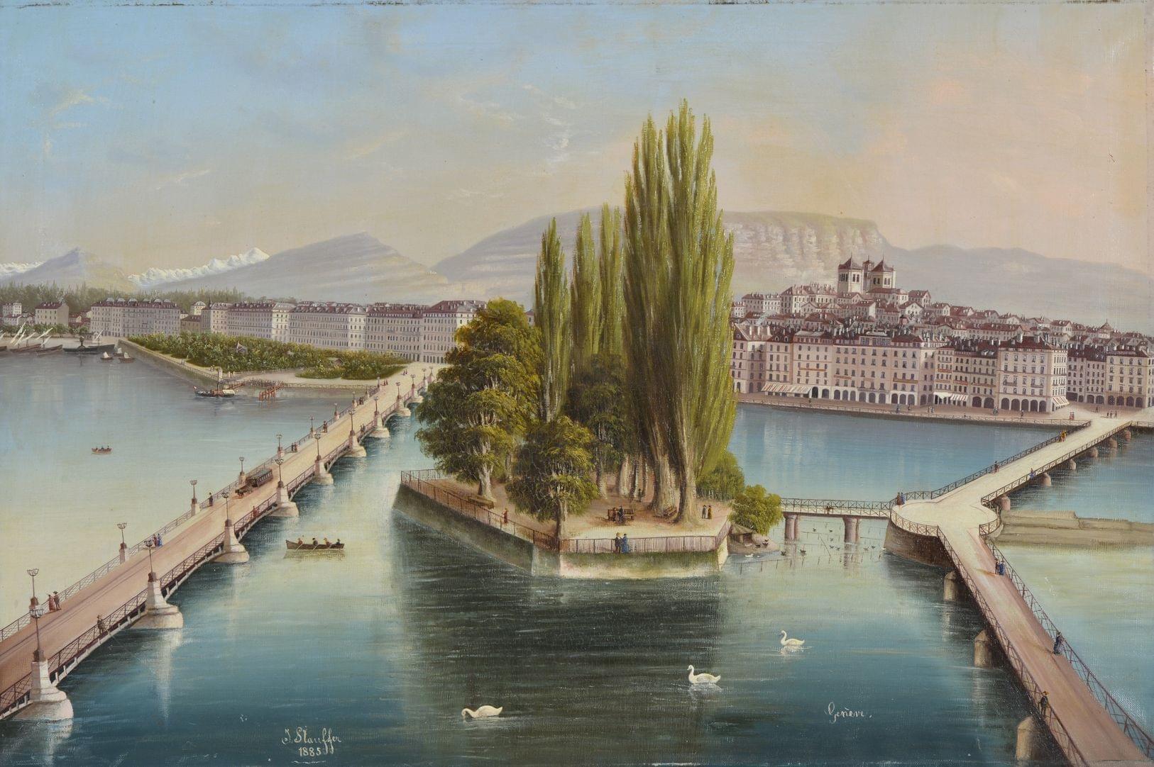 Vue de Genève, lithographie rehaussée sur papier, 35x53 cm
