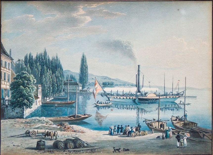Bateau à aube quai des Bergues, lithographie rehaussée, 15x21 cm