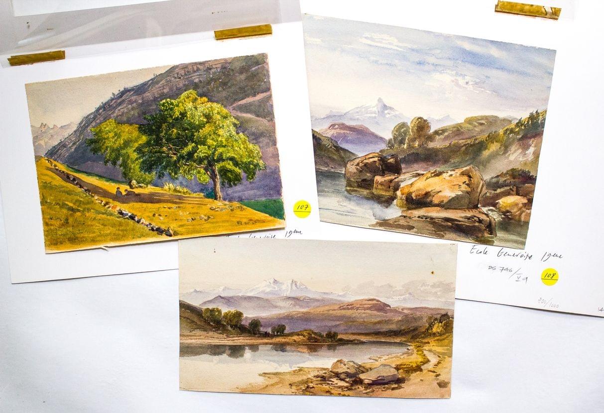 Massif enneigé, Le repos sous les arbres et rochers près d'un lac, suite de 3 aquarelles sur papier, 16x28, 18x28 et 20x28 cm