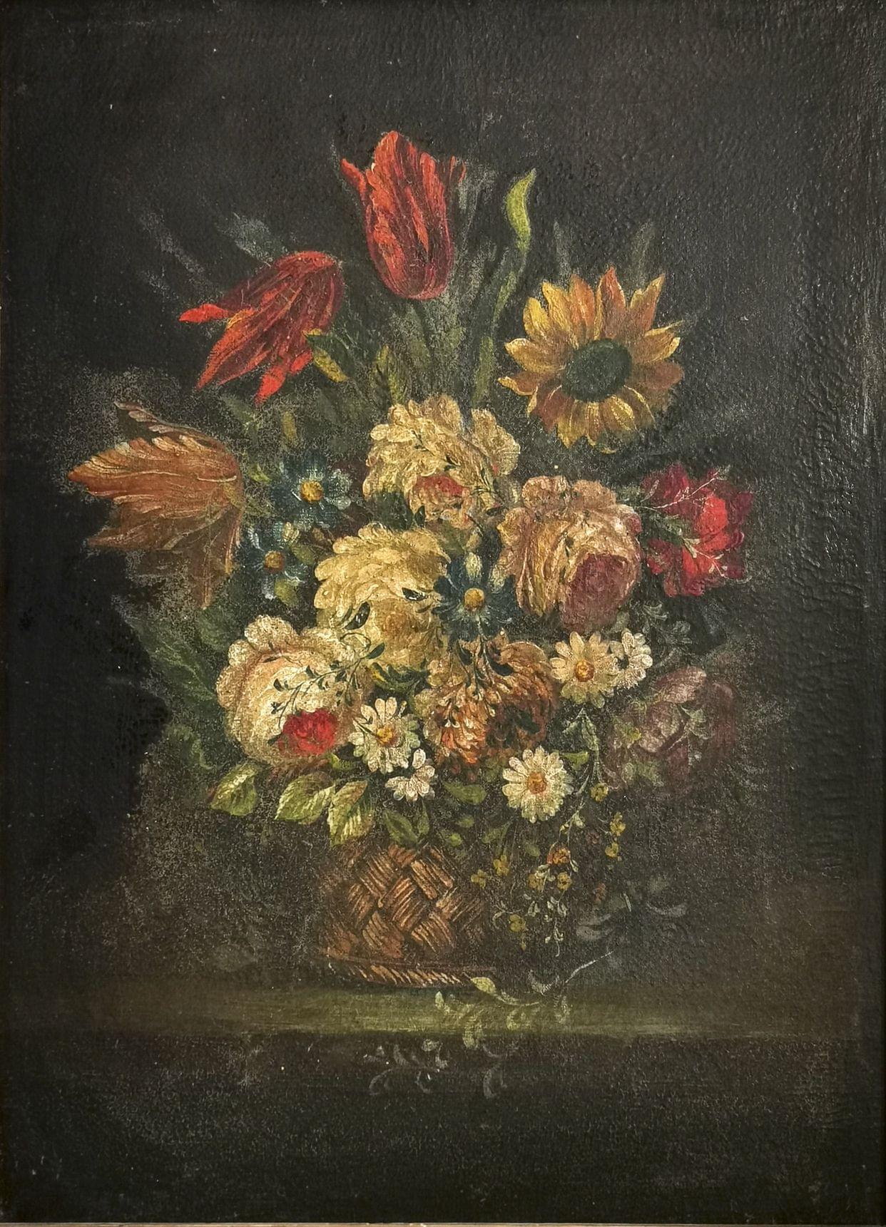 Bouquet de fleurs dans un panier en osier, huile sur toile, 47x35 cm