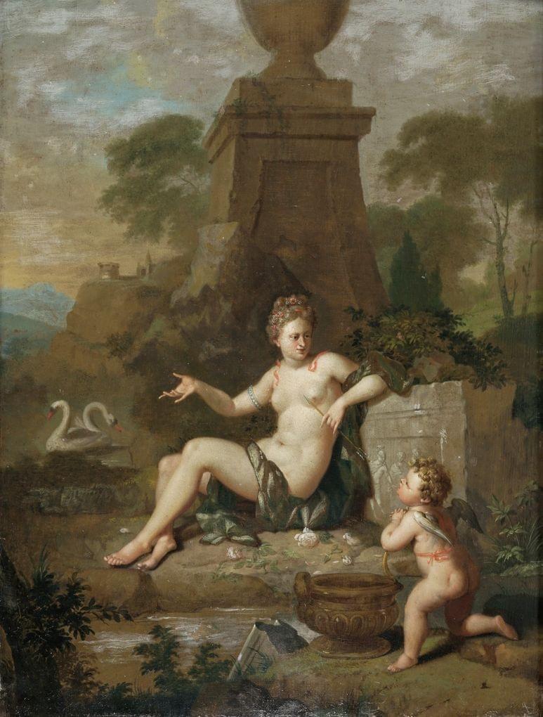 Venus et Cupidon, huile sur panneau, , trace de signature, marque de collection à la cire et inscription en cyrillique au verso, 49x37 cm