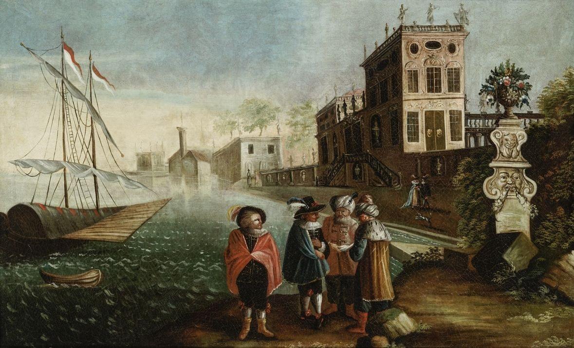 Scène animée près d'un plan d'eau, aquarelle et encre sur papier...