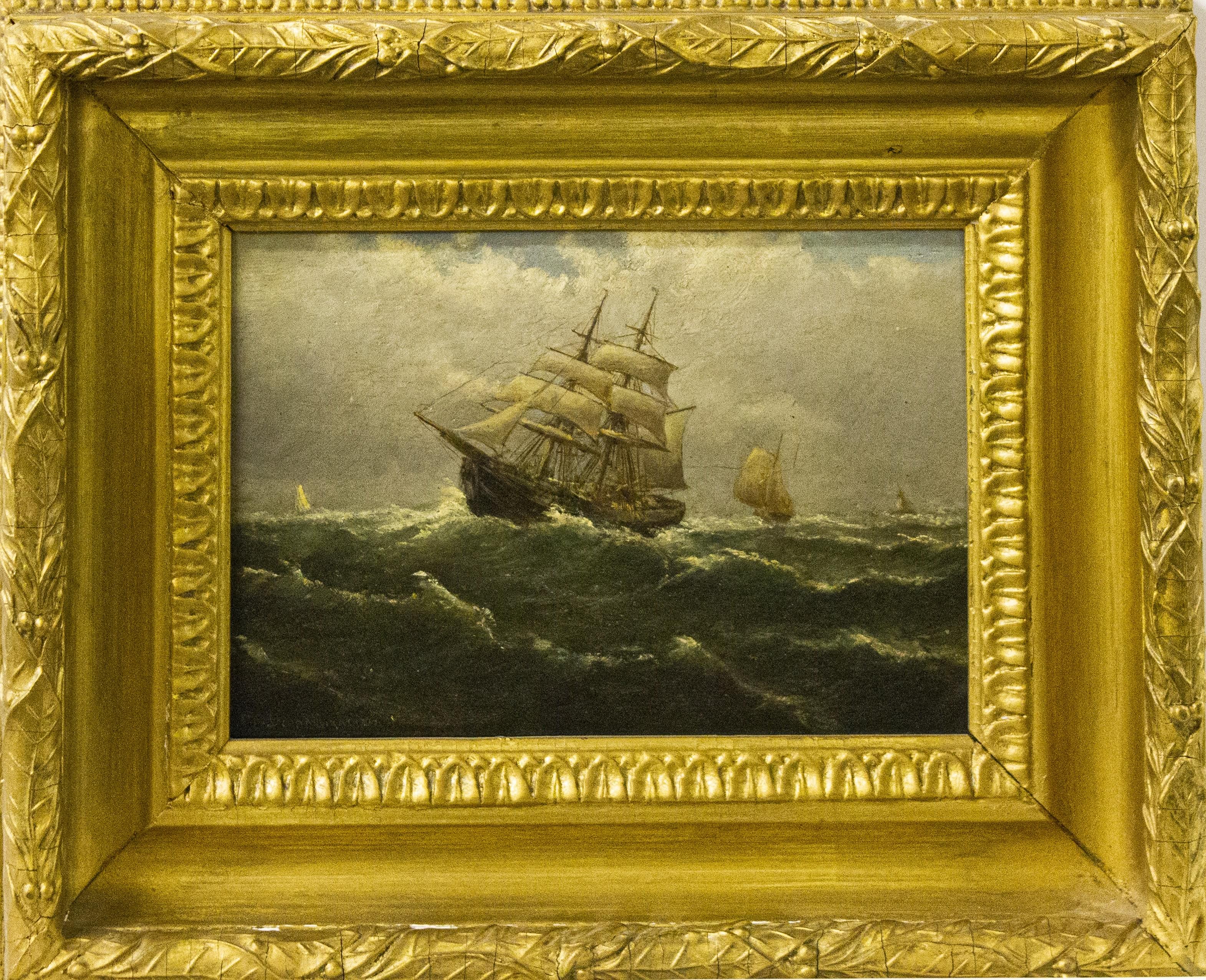 Navire en tempête, huile sur panneau, signature non identifiée, 17x24 cm