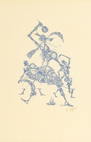 Guerriers futuristes, gravure sur papier signée A. Polerora, dat...