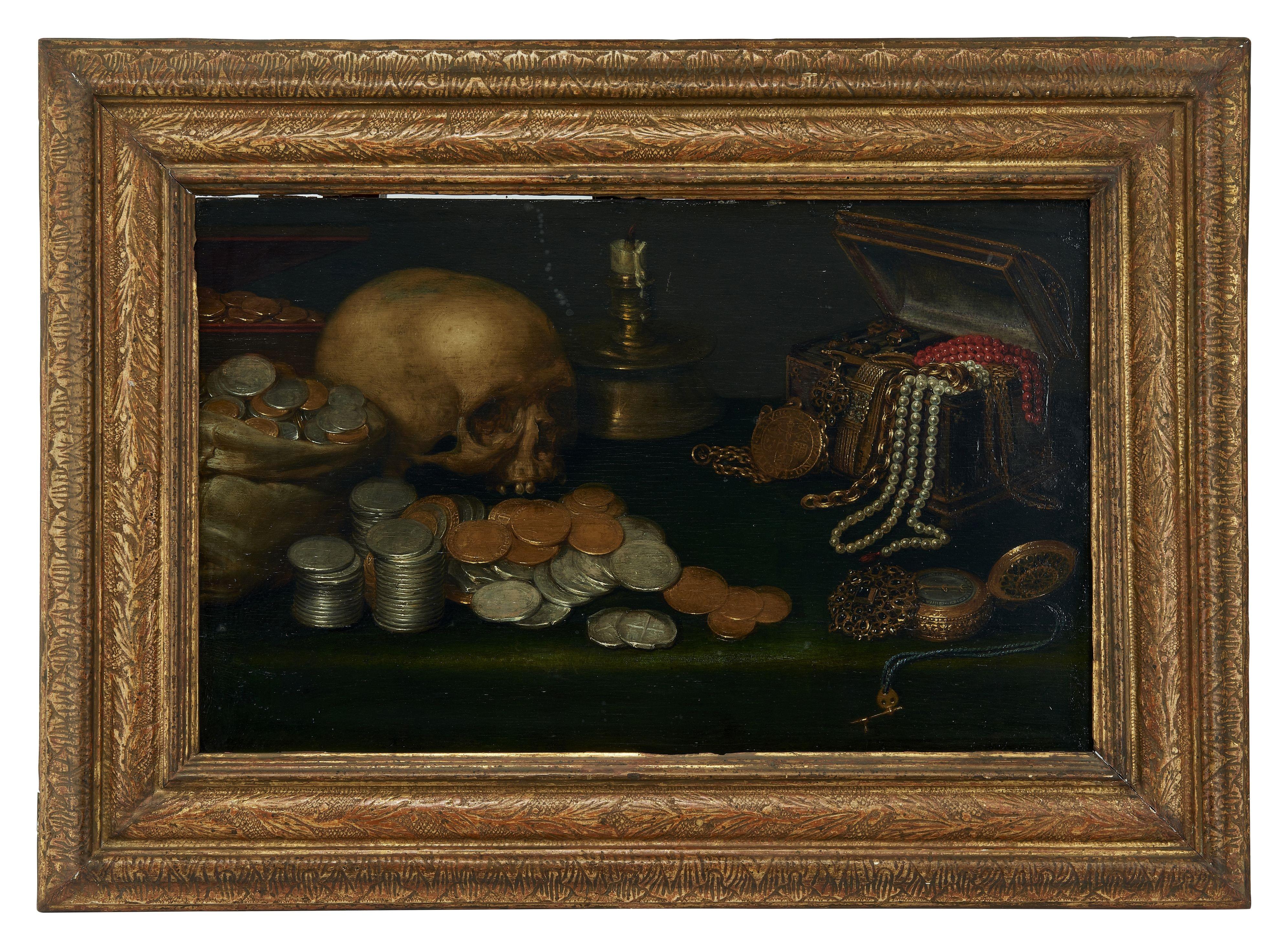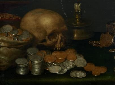 Vanitas, huile sur panneau, 32x53 cm. La médaille représentée commémore la bataille de Turnhout qui eut lieu en 1597 et marqua la victoire des troupes hollandaises commandées par Maurice de Nassau sur l'armée espagnole.