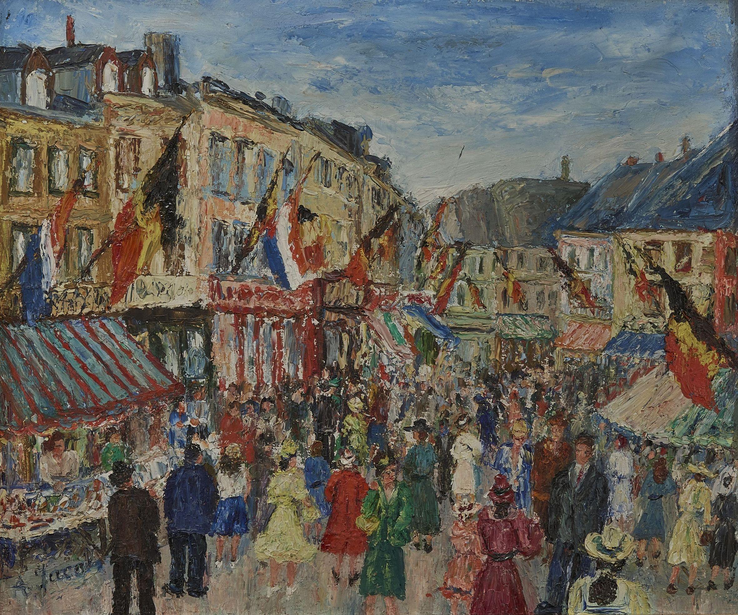 Rue bondée, huile sur toile, signée A. Jacob, 50x60 cm