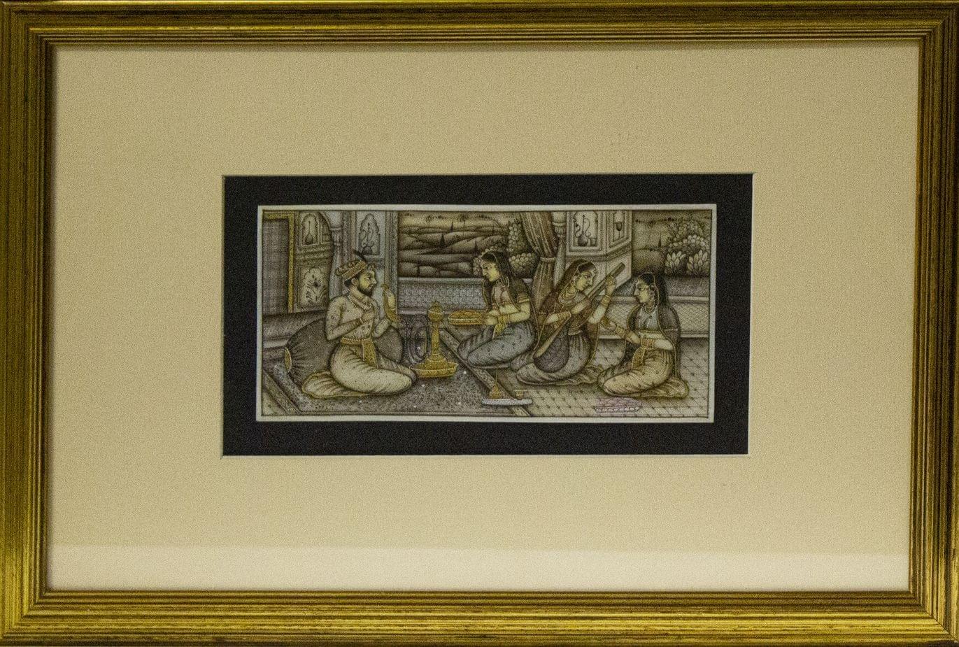 Miniature figurant un personnage avec trois servantes, pigments sur ivoire, 7,5x15 cm