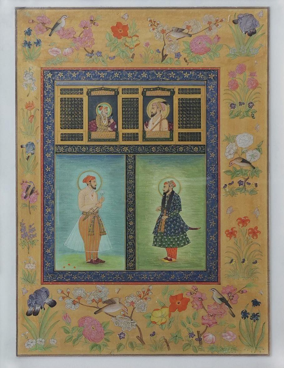 Deux personnages en pied, nimbés, l'un figurant probablement Shah Jahan. Ils sont surmontés de deux personnages en buste également nimbés, marges à décor de motifs floraux, gouache sur papier, 38x27 cm
