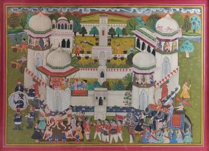 Fête devant un palais et procession avec un maharaja, deux gouaches sur papier, 48x67 cm