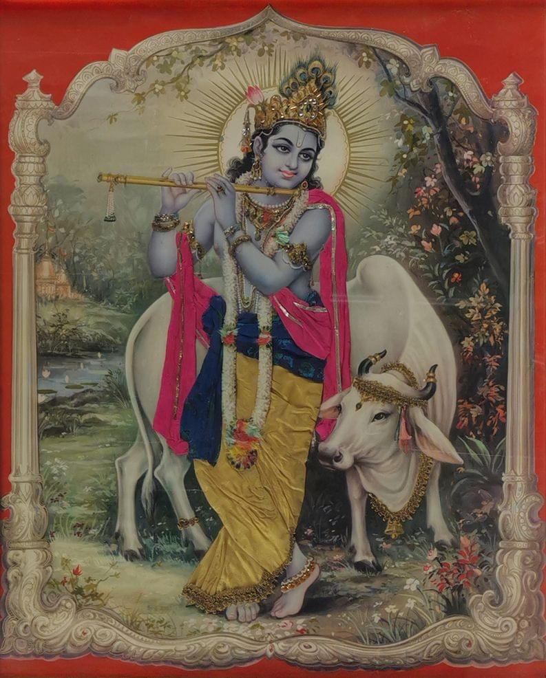 Divinité à la flûte, gravure, collage et tissu, 58x47 cm