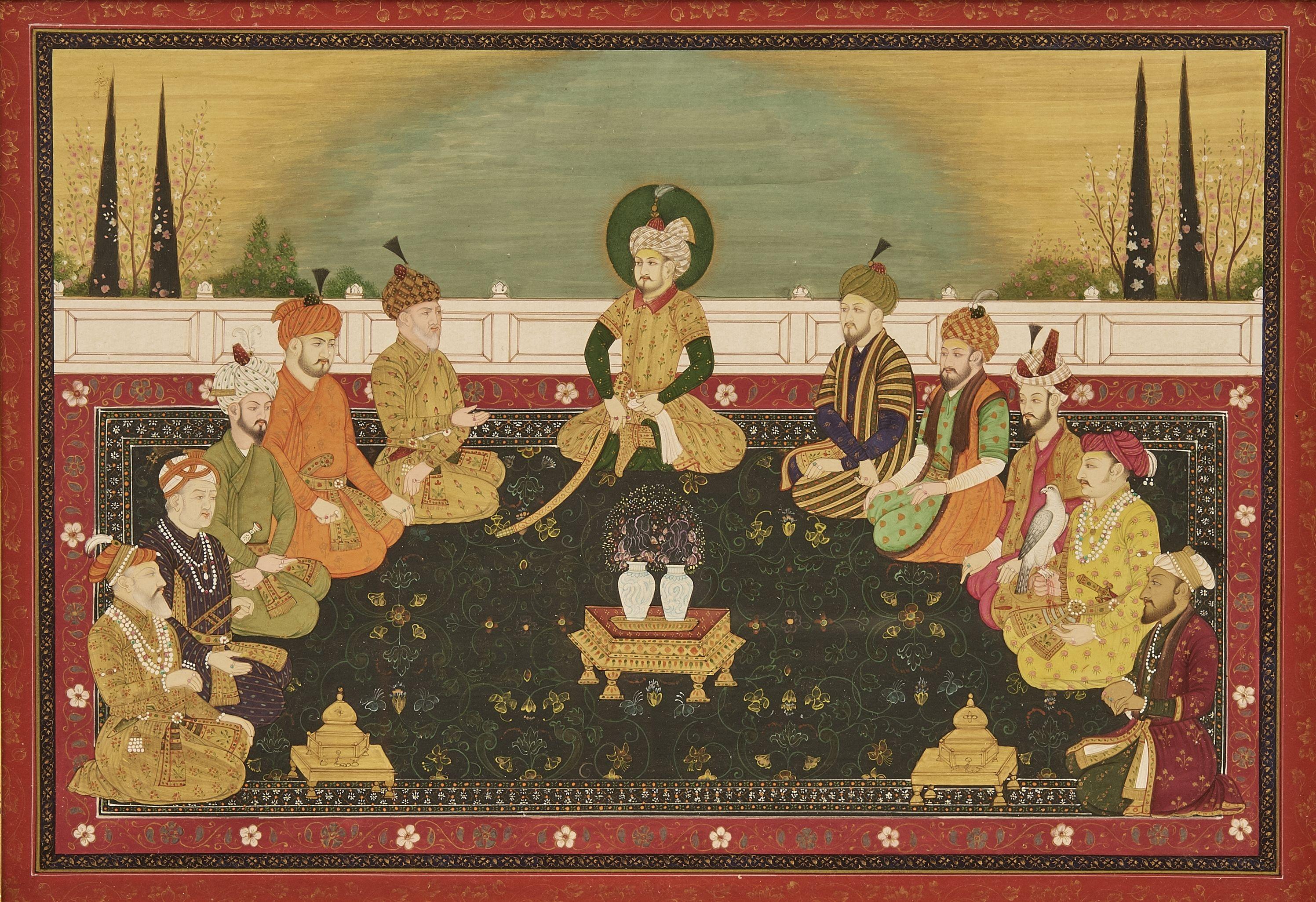 L'empereur Akbar avec les Navratnas, gouache sur papier, 31x45 cm,