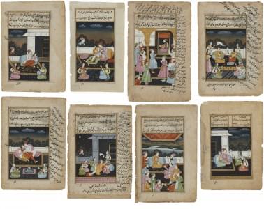 Huit miniatures à décor de scènes animées, gouache et encre sur papier, 21x14 cm. Provenance: collection Pernet-Villaverde