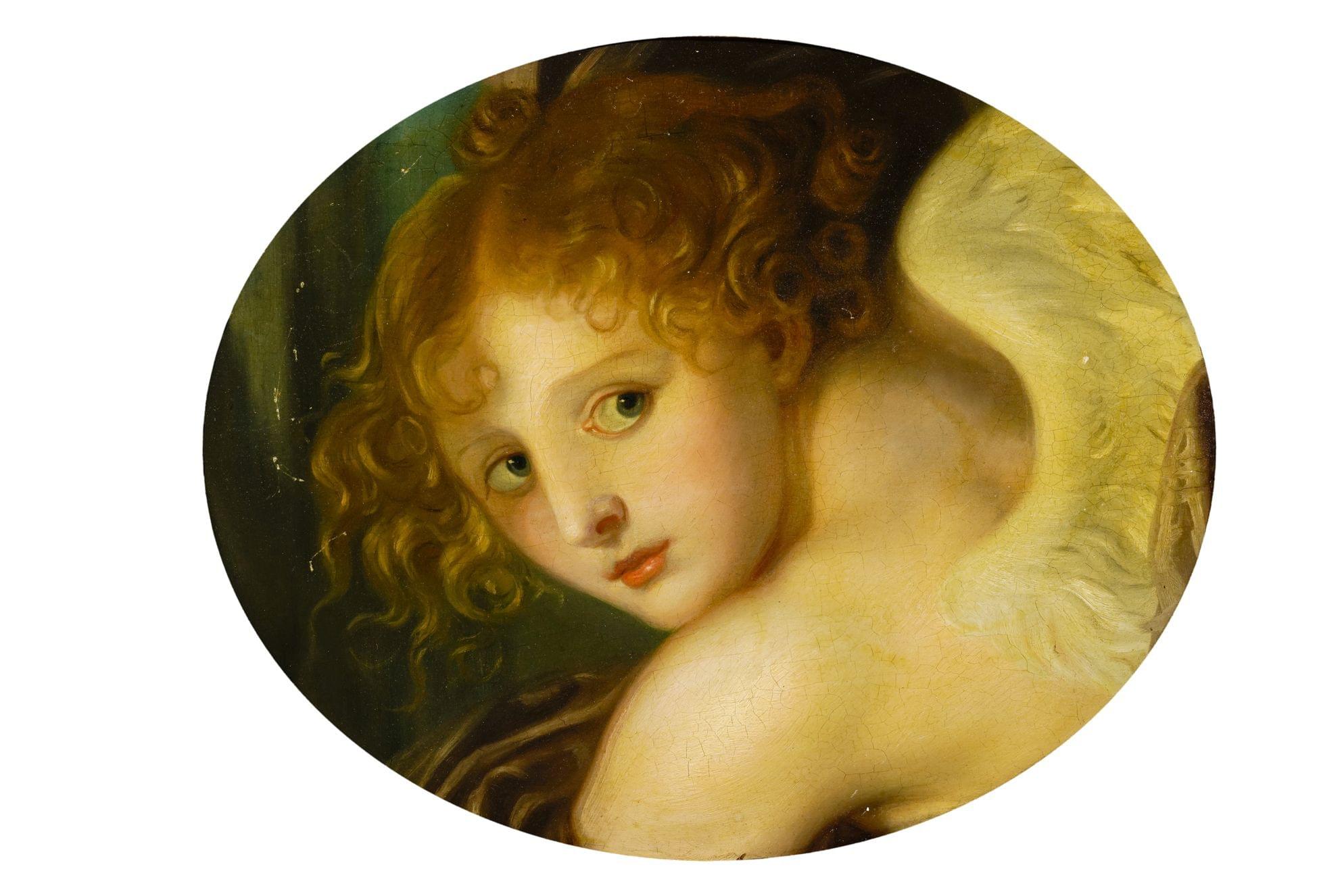 Ange, huile sur panneau ovale, cadre d'époque XVIIIe s en bois sculpté et redoré D 39,5 cm