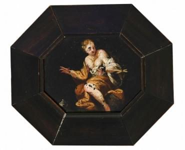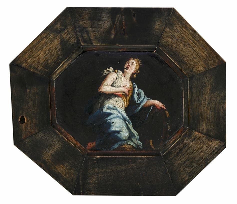 Sainte Catherine d'Alexandrie et Sainte Femme, paire d'huiles sur ardoise, 14x18 cm