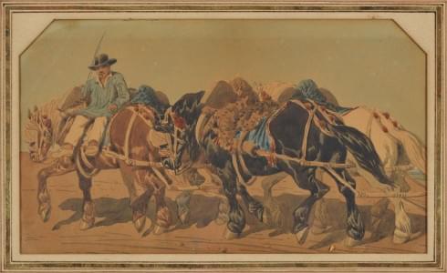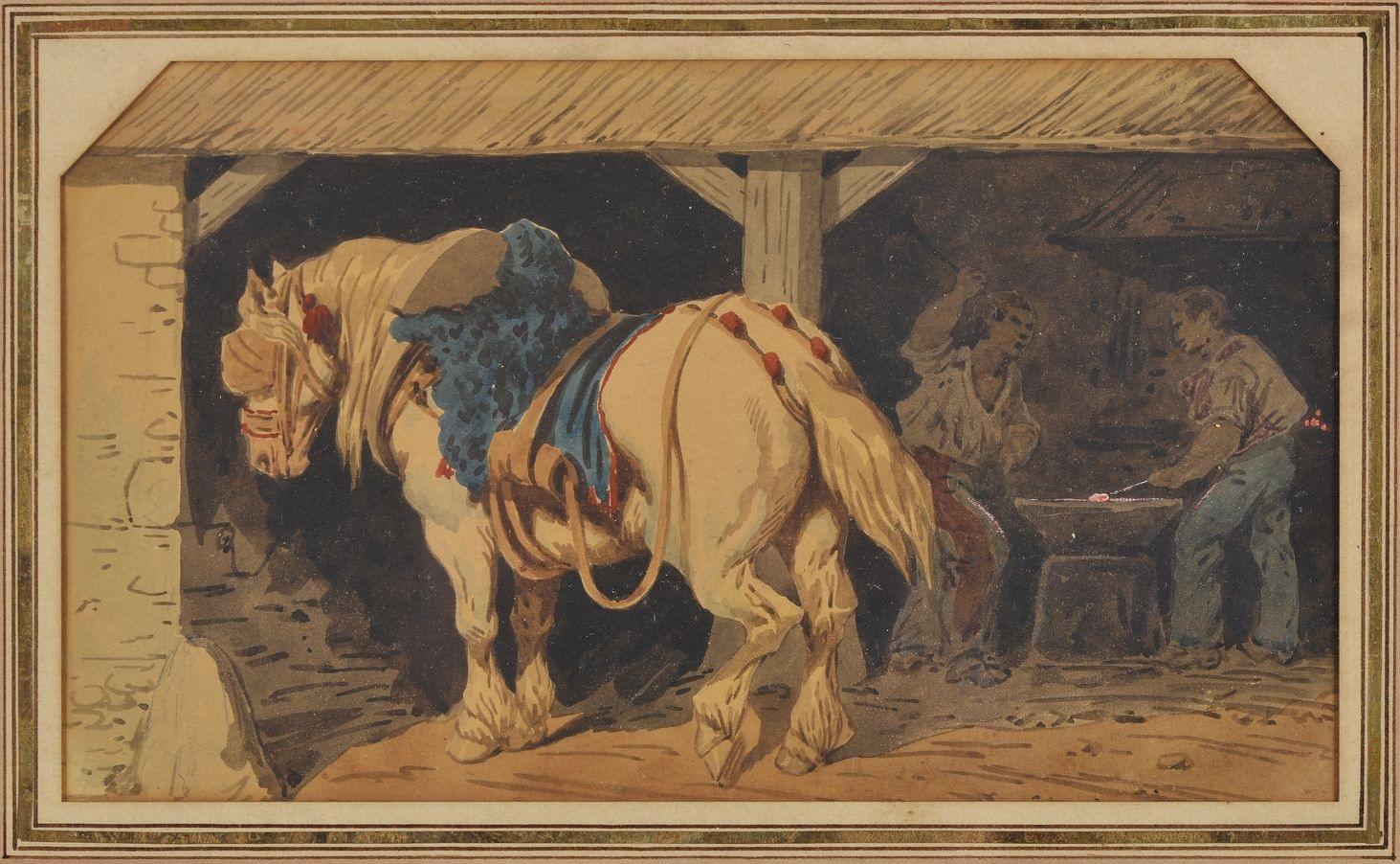 Maréchal ferrant et attelage, paire d'aquarelles, 14x24 cm